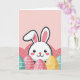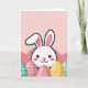 This design shows a stylized white rabbit peeking up with wide black eyes, rosy cheeks, and a small smile that feels like a friendly hello 🐰. Its long ears rise straight up, edged in thin dark lines with soft pink inner fur, set against a light pink background. In the foreground, a row of decorated egg shapes sits like a little fence, as if the bunny is shyly leaning in from behind them the way a close friend might. The eggs are colored in soft teal, sunny yellow, and pale pinks, each topped with white patterns like dots, wavy lines, and stripes. A gently curving pink shape with dotted texture appears behind the rabbit, adding another layer and a cozy, tucked-in look. The overall palette stays light and pastel, with smooth shading that keeps the scene bright and sweet 🌷. There is no visible text, leaving the upper pink area open and uncluttered. The bunny’s ears stand tall above the patterned eggs, with the dotted pink curve running behind its head.