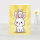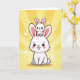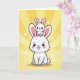 This card features two rounded white rabbits 🐰, with the larger one sitting calmly while a smaller rabbit perches on its head as if leaning in close like a trusted friend. Their big dark eyes and tiny upturned smiles face forward, and the soft blush on their cheeks suggests a gentle fondness between them. The inner ears are tinted light pink, and the figures are outlined in smooth black lines that make their shapes stand out clearly. Behind them is a bright yellow background filled with wavy sunbeam stripes spreading outward, giving the scene a warm, sunny setting. A few small white glowing circles float around the rabbits, adding a light, airy touch 🌷. A soft ochre shadow sits beneath the larger rabbit to ground it on the page. Any greeting text could sit neatly near the top or bottom in a simple black or dark gray color without crowding the artwork. The final visual detail is the smaller rabbit balanced right between the larger rabbit’s ears against the radiating yellow stripes.