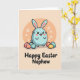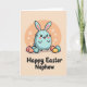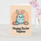 This card features a round, light blue cartoon bunny centered in the design, with wide ears, rosy cheeks, and a tiny tongue peeking out for a friendly, affectionate look 🐰. A soft peach circle sits behind the bunny’s upper half like a gentle spotlight, adding a cozy, close-to-you feel. Around the bunny, decorated egg shapes in pink, yellow, and blue float nearby, as if they’ve been gathered and shared between friends. Some eggs have stripes while others show small star motifs, bringing a sweet, celebratory rhythm to the scene 🌷. The background is dotted with small white flowers with orange centers, spaced out to keep the focus on the bunny while still suggesting springtime. Along the bottom edge, a short greeting appears in thick black lettering, centered and easy to spot against the lighter colors. The overall look uses flat pastel tones with darker outlines, and the peach circle, eggs, and blossoms frame the bunny in a neat, balanced arrangement. The bunny’s face sits forward in the middle, with the peach circle behind its head and the patterned eggs scattered around its sides.