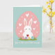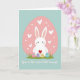 This card features a stylized white long-eared bunny with tiny black eyes and soft rosy cheeks, wearing a bright red heart on its chest 🐰. The bunny sits on a patch of green grass, its gentle posture and sweet expression suggesting a tender, affectionate bond like a quiet inside joke between close friends. Behind it, a large soft pink egg shape creates a cozy backdrop, sprinkled with small white hearts that drift upward like little notes of affection. In the foreground, four decorated eggs rest among the grass, each patterned with stripes, stars, or dots in pastel pink, purple, yellow, and blue 🌷. The background is a muted teal that keeps the scene calm and airy while letting the warm colors stand out. Along the bottom edge, the phrase “You’re the cutest little bunny!” appears in white cursive lettering, centered and easy to spot. White heart shapes of different sizes are scattered across the pink egg backdrop behind the bunny.