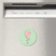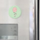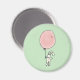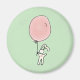 A round magnet with a whimsical bunny holding a big pink balloon floating up in the air. Set on a light green background.