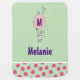 A personalized blanket with a name and monogram initial. The bottom has a border with pink circles set on a light green background with a whimsical white bunny holding a big pink balloon floating up in the air. A little bluebird sits on top of the balloon, whistling a tune surrounded by song notes.