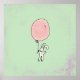 A poster with a whimsical bunny holding a big pink balloon floating up in the air. Set on a light green background.