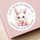 Bookplate labels featuring a cute watercolor painting of a little bunny holding a red heart and customizable text "this book belongs to" and your name on a white background.