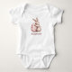 This baby bodysuit features a cute baby bunny hugging a mauvy pink easter egg with white polka dots. Your child's name appears in charming lettering underneath the rabbit artwork. This is a great design for Easter but would be a cute design on other spring days.