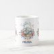 A personalized mug. An illustration created with watercolors. A cute bunny rabbit wearing a blue dress sitting in a basket surrounded by her eggs. Butterflies flutter around the basket which is decorated with a fancy flower bouquet.