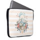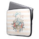 A laptop sleeve with an illustration created with watercolors. A cute bunny rabbit wearing a blue dress sitting in a basket surrounded by her eggs. Butterflies flutter around the basket which is decorated with a fancy flower bouquet.