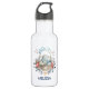 A cute personalized water bottle. With an illustration created with watercolors. A cute bunny rabbit wearing a blue dress sitting in a basket surrounded by her eggs. Butterflies flutter around the basket which is decorated with a fancy flower bouquet.