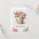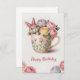 A birthday greeting card featuring a playful watercolor-style illustration of a tiny bunny with a bright pink bow peeking out from inside a ceramic coffee mug and delicate pastel-colored roses.