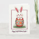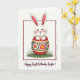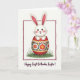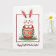 The front design shows a soft white, long-eared bunny peeking out from a decorated egg, its round face tipped forward with a tender, curious look that feels like a quiet hello 🐰. Subtle rosy cheeks and wide dark eyes draw you in, and a tiny pink tongue shows between a gentle smile while its small paws rest on the egg’s rim. A rustic rectangular border in deep maroon surrounds the scene, giving it a cozy, close-to-the-heart feel like a note shared between friends. Below the egg, a small scatter of emerald green grass adds a springtime touch 🌷. The egg is covered in folk-style floral patterns, with crimson and sunny yellow blossoms set on a deep teal band, plus cream accents and a warm earthy red base. Across the top, a short greeting sits centered in maroon lettering, with a smaller line of text placed beneath the illustration in a lighter red. The background stays bright white, and the maroon frame has slightly uneven, hand-drawn lines at each corner.