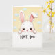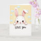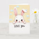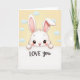 This greeting card shows a fluffy white rabbit peeking up from the bottom edge, with its little paws resting on a white banner. Above the rabbit is a warm yellow-apricot sky with soft powder-blue clouds, like a calm early morning. The rabbit’s ears are tall with pale pink inside, and its big brown eyes look wide and gentle, with dark lashes that make it feel extra sweet. A tiny pink nose and rosy cheeks give it a shy, caring expression, like it’s working up the courage to say something kind. On the banner, the words “LOVE you” appear in dark, flowing cursive-style letters, centered near the bottom of the card. The simple scene and soft colors make it feel comforting and affectionate, whether you’re giving it to a partner or a close friend 🥰❤️. It’s an easy way to say “I care about you” without needing a lot of extra words