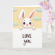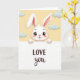 This greeting card shows a sweet white rabbit peeking up from the bottom edge, with its front paws resting on a bright white sign. Its big glossy brown eyes look wide and kind, with a little pink blush on its cheeks, a tiny pink nose, and a gentle smile that feels friendly right away. The rabbit’s tall ears stand up with soft pink on the inside, framing its face as it looks straight at you. Behind it is a muted yellow background with a few pale blue-grey clouds, like a calm sky. On the sign, the words “LOVE you” appear in dark brown, hand-drawn lettering, stacked one word above the other near the center. The simple colors and soft shading make the whole scene feel calm and caring, like a small moment of affection you can hold. It’s an easy card to give when you want to say you care without making a big speech 🥰❤️.
