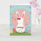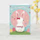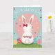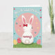 This card shows a white bunny seen from behind, shaped a bit like a smooth egg, with tall ears dotted in red and a small red bow at its neck 🐰. Across the bunny’s back, the word “mommy’s” appears in red lettering, sitting neatly over the rounded shape like a sweet label. The bunny stands on a strip of green grass sprinkled with tiny white sprigs, as if it has paused near someone it trusts. Around its feet are four decorated eggs with stripes and spots in yellow, red, blue, and pink, adding a festive spring scene 🌷. The background is a soft sky blue with a large blush-pink circle behind the bunny that frames it like a gentle spotlight. Small pastel hearts in red, golden yellow, teal, and light pink float upward, suggesting a tender bond in the air. Near the top, the phrase “You’re the cutest little bunny!” is written in dark lettering and centered above the scene. The bunny’s fluffy white tail is textured and stands out against the green grass and the pink circle.