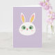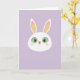 This greeting card features a stylized bunny face centered high on the page, with a smooth white head set against a wide lavender background 🐰. Large round eyes in rich green sit evenly on the face, each with a deep black pupil and tiny white highlights that make the gaze feel attentive, like it’s meeting a friend’s eyes. A small pink nose and a gently curved mouth form a soft smile, with faint rosy circles on the cheeks that read like a shy, affectionate blush. Thin white whiskers extend outward in neat lines, keeping the look simple while adding a touch of detail. Two tall ears rise above, outlined in white with soft pink inner edges, and a warm yellow section inside each ear sprinkled with irregular black dots. Along the lower portion of the lavender area, a short greeting appears in small white lettering, centered and spaced to leave plenty of open room around it 🌷. The overall layout stays uncluttered, with the bunny’s head in the upper center and the dotted yellow ear interiors standing out against the pastel field.