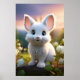 Poster of a cute white rabbit with big blue eyes and fluffy fur siting amidst white flowers and green foliage, with a soft sunset in the background. The scene evokes a sense of warmth and serenity.