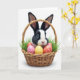 This design shows a black-and-white rabbit with bright blue eyes peeking out of a woven basket on a white background, its gentle gaze giving the scene a sweet, friendly closeness 🐰. Soft light falls across its fur, highlighting fine whiskers and a small pink nose as if it’s leaning forward to be noticed. Long ears edged in dark fur rise above the basket handle, framing its face in a tender, attentive pose. Around the basket sit decorated eggs in soft pink with dots, sunny yellow with short dash marks, and warm coral with matching strokes, arranged like a cheerful little gathering. The eggs rest in green faux grass, adding a springtime setting that feels like a shared moment between friends. Near the top, simple Easter text appears in a light pastel color, centered and easy to read against the white space 🌷. The basket’s natural weave adds cozy texture beside the smooth eggshells and the rabbit’s plush coat. Small blades of green grass tuck around the eggs at the base of the basket.