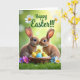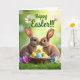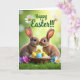 This card features two bunny-like animals facing each other in the center, their noses gently touching as if sharing a quiet, affectionate moment 🐰. Their soft brown-and-cream fur and wide, dark eyes draw you into the scene, giving them a tender, friendly look. Between them sits a small woven basket holding two fluffy yellow chicks, nestled close together as though they feel safe. Near the basket are two smooth eggs, one bright yellow and the other a light sky blue, adding a simple springtime contrast. The ground is covered in fresh green grass dotted with small pastel flowers in purple, pink, and pale blue, with a few white daisy-like blooms nearby 🌷. Across the upper area, a short Easter greeting appears in green, placed above the characters so it reads clearly against the softly blurred background. Behind everything, the backdrop fades into warm golden light and soft green tones, like a sunny meadow out of focus.