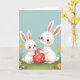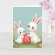 Designed with two white bunny characters at the center, a taller one stands close to a smaller companion as they hold a large red egg together, their paws meeting in a gentle, shared grip 🐰. Their ears are upright with soft pink inner details, and their rosy cheeks and small smiles suggest a tender bond, like close friends or family sharing a quiet moment. The egg is rich red with scattered white polka dots, making it the strongest color accent on the front. In the lower area, stylized green grass spreads across the scene, dotted with simple flowers in yellow, red, and white 🌷. Above them, a calm aqua-blue sky fills the background, keeping the focus on the pair and their shared “gift” in the middle. Light shading adds a bit of depth to their faces and to the curve of the egg without making the scene feel heavy. A short Easter greeting sits near the top in a soft, easy-to-read color that contrasts gently against the sky. The red egg with white dots sits between the two bunnies, centered against the green grass and aqua sky.