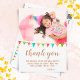 Cute bunting flag birthday photo thank you postcard. Thank your guest for coming to your child`s birthday party! The design has colorful birthday party bunting flags and a photo - insert your photo into the template. The text is the trendy script - change the thank you message if you want and the child's name.