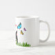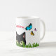 If you love cats then you will think this coffee mug is darling. The graphic design shows the face of a black cat peeking around the grass while looking at butterflies. This mug has the word Meow but you can customize with your own words.