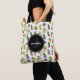 A tote bag with a cute and fun pattern. Illustrations of different cactus, sitting in flower pots with cartoony happy smiling faces. Personalize with a name and initial inside a black circle.