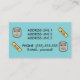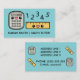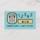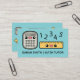 This adorable math tutor / math teacher business card design features a cute grey cartoon calculator and a cute yellow cartoon ruler with happy face expressions. There are also black numbers from one to five. The background color is blue.