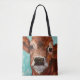 This tote is graced by a painting of a cute calf done with an aqua background. Help out the environment by shopping with reusable bags.