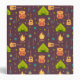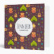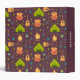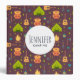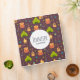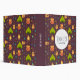 A personalized binder with a fun camping themed pattern. Set on a reddish brown background. Elements in the pattern include a campfire, a tent,. a guitar, a shovel and backpack.