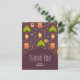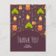 Thank you postcard with a fun camping themed pattern. Set on a reddish brown background. Elements in the pattern include a campfire, a tent,. a guitar, a shovel and backpack. Easily personalize the front with a name and a message on the back.