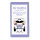 Fun mini wine bottle labels done in a white, with a periwinkle blue frame around the outside edge. Cute graphics of a newly wed couple's get away car, on the bottom, and periwinkle blue custom text, on the top half of the label. All the text is ready to personalize for your wedding day. Great for individual wine or champagne bottles as favors for your wedding guests. Perfect as part of each place setting for the champagne toast.