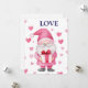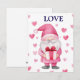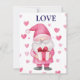 cute card with a cartoon pink gnome in love with a heart for the holiday in February on Valentine's Day