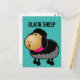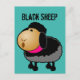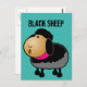 A drawing of a cute black sheep with a hot pink collar. Text says black sheep in a black splattered paint font.