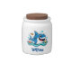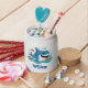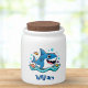 This personalized candy jar features a happy blue shark surrounded by colorful fish and bubbles, with bright, bold colors and a friendly ocean vibe.
