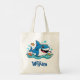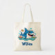 This personalized tote bag features a happy blue shark surrounded by colorful fish and bubbles with bright, bold colors and friendly ocean vibes.