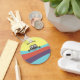 Cute cartoon character kids keychain with a funny creature with sharp teeth biting on colorful stripes in blue, purple and red colors against light yellow background and customizable name. Fun and whimsical personalized design for cheering up yourself and everyone you meet.