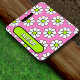 Personalized garden kneeling cushion in a pretty pattern of cute cartoon white and lime green daisies on a bold and summery pink background.