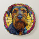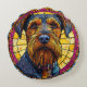 Portrait of a dog with a thick, bushy beard and expressive eyes, framed by a vibrant stained glass-like background in yellow, pink, and blue hues.
