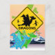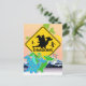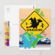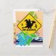 Cute Cartoon Dragons with Beware of Dragons Sign Postcard. Cute green and blue cartoon dragon with color star wings and big star tail and yellow black warning traffic sign with dragons in a dragon fantasy world with snowy mountains and castle postcard. This colorful cute cartoon dragons postcard is fully customizable, add your text(s) and images!