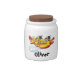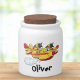 This personalized candy jar features a bright and cheerful cartoon illustration of a smiling yellow and red firefighting airplane spraying water.