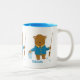 A cute mug for kids with a cartoon brown bear with a fishing rod in one hand and a bucket full of fish in the other . Personalize it with the child's name .