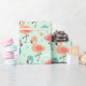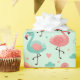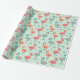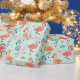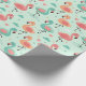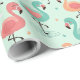 This wrapping paper features pink, teal, and peach cartoon flamingos standing, decorated with pastel hearts, clouds, and stars on a mint green background.