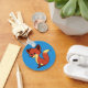 A blue keychain with a cute smiling red, brown and cream colored cartoon fox with pointy ears and a large bushy tail.
