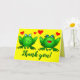Happy green cartoon frogs with blue eyes, red hearts and a cheerful yellow background. This card says "Thank you!" in a cool dancing script style, and is blank inside so you can write your personal message of wit and wisdom. If you want different words on front, you can change the text right on the product page. Frogs can represent friendship, affection, romance, dreams, music and singing, celebration, happiness, good luck and good health. Send or give this to friends and family, a cute couple, neighbor, teacher or volunteer, or anyone who deserves a heartfelt thanks. This is a hand drawn original frog design by M Sylvia Chaume, Canada. Hoppy Blessings!