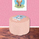 An adorable round pouf suitable for a nursery room , a child's room or a kid's reading corner in a school library . It has a peach color and a polka dots pattern on the side . On the top and bottom is the illustration of a cartoon gray koala with pink hearts . Personalize it with a child's name or a school's name . It is gender neutral and will be perfect for either boys or girls .