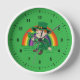 Clock with an Illustration of a cute smiling leprechaun wearing a green suit, a top hat while holding a shamrock leaf, with a colorful rainbow in the background