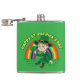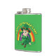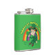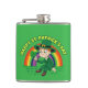 Flask with an Illustration of a cute smiling leprechaun wearing a green suit, a top hat while holding a shamrock leaf, with a colorful rainbow in the background and text saying "Happy St. Patrick's Day"