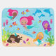 Delight your little girl with this adorable personalized mermaid baby blanket. Blanket features five mermaids, sitting, swimming, and having fun. There are also dolphins, colorful fish, seahorses, seashells, and sea grass. The dolphins have a dolphin family (mommy, daddy, baby), and the seahorses have a parent and baby, too. The mermaids have cute, bright hair of pink, purple, brown, and yellow. Customize the blanket with your young one's first name.