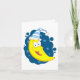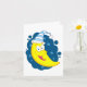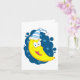 Send a sweet message with this whimsical moon banana greeting card. The design features a happy yellow crescent moon character wearing a blue striped nightcap against a starry night sky. It is an ideal choice for birthday wishes, baby shower notes, or a simple bedtime greeting for loved ones. This celestial card offers a blank interior for your personal message, making it a versatile and charming option for anyone who loves cute and quirky illustrations.