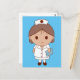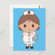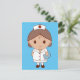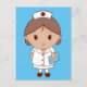Cute cartoon nurse with brown hair and a sweet smile. She is wearing a white nurse outfit and hat and carrying a blue medical file under one arm.