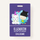 Name badge with a whimsical image of a unicorn and bird. This pair is happily smiling while hanging out together. A little heart hovers above their head. Unicorn is white with angel wings and a pink horn. The bird is a greenish blue color wearing a black toque with black kitty cat with ears. A blue cloud placed behind these happy best friends.